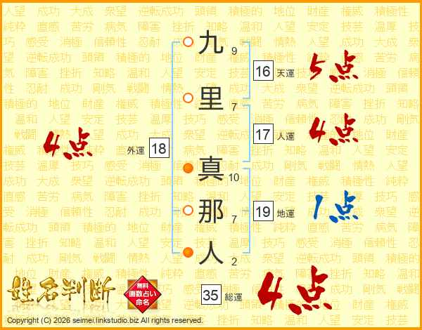 九(9画)里(7画) 真(10画)那(7画)人(2画)
