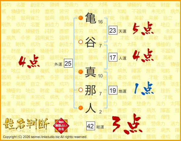 亀(16画)谷(7画) 真(10画)那(7画)人(2画)