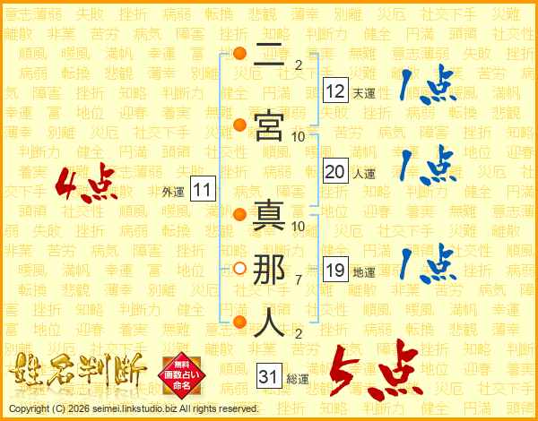 生活面を象徴する運勢です。外部から受ける影響力を表し、結婚運、家庭運や職場、環境への順応性を表します。総運から人運を引いた画数。姓や名が1文字の場合を除く。