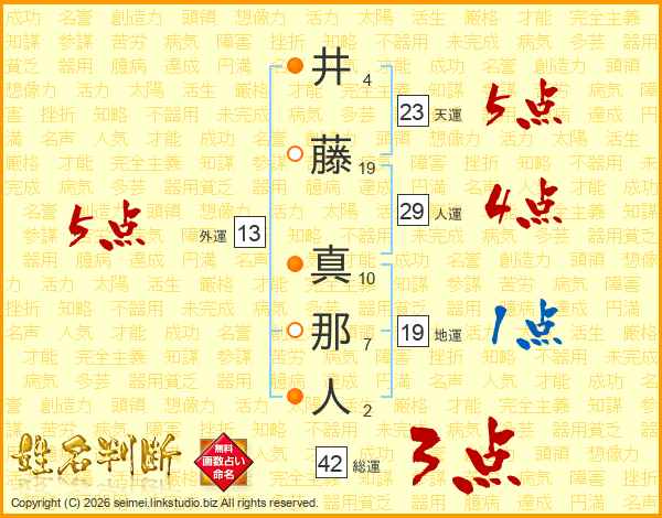 井(4画)藤(19画) 真(10画)那(7画)人(2画)