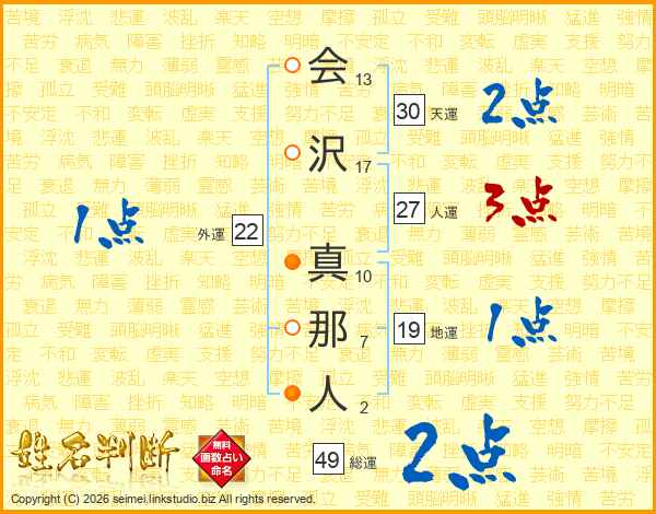 会(13画)沢(17画) 真(10画)那(7画)人(2画)