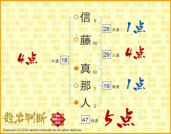 信(9画)藤(19画) 真(10画)那(7画)人(2画)