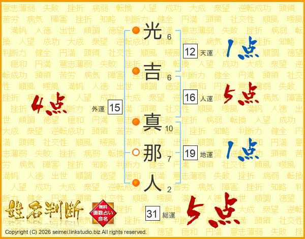 光(6画)吉(6画) 真(10画)那(7画)人(2画)