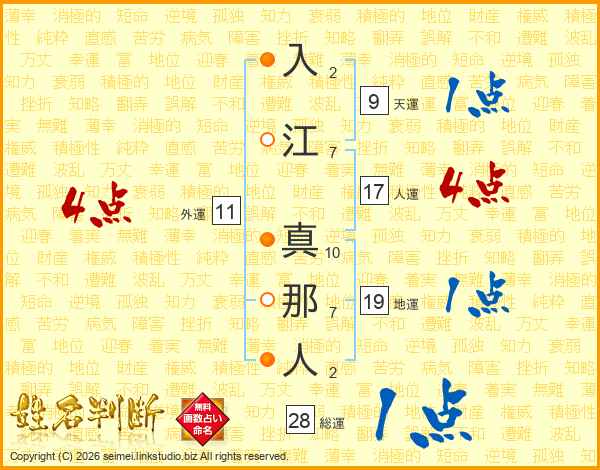 入(2画)江(7画) 真(10画)那(7画)人(2画)