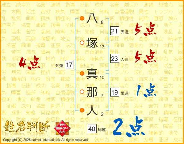 八塚真那人さんの天運は21画の5点!