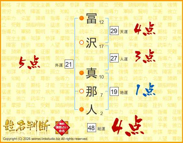 冨(12画)沢(17画) 真(10画)那(7画)人(2画)