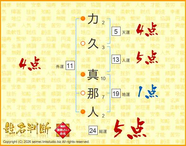力(2画)久(3画) 真(10画)那(7画)人(2画)