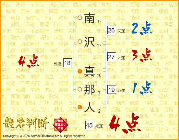 南(9画)沢(17画) 真(10画)那(7画)人(2画)