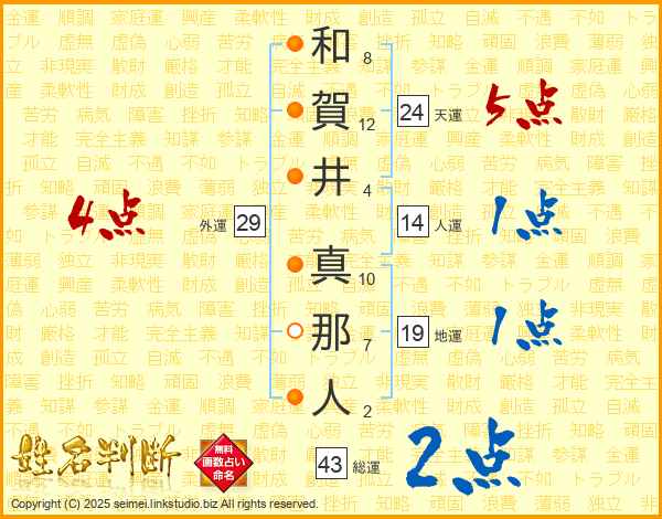 和(8画)賀(12画)井(4画) 真(10画)那(7画)人(2画)