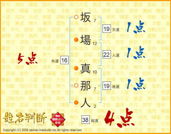 坂(7画)場(12画) 真(10画)那(7画)人(2画)