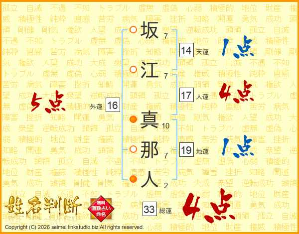 坂(7画)江(7画) 真(10画)那(7画)人(2画)