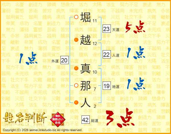 堀(11画)越(12画) 真(10画)那(7画)人(2画)