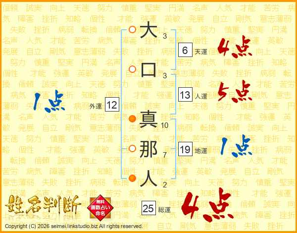 大口真那人さんの総運は25画の4点!