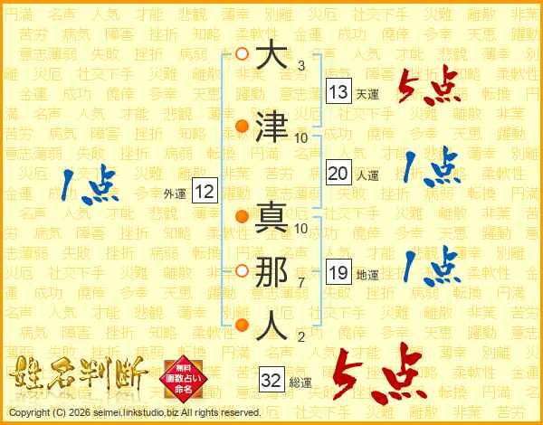大(3画)津(10画) 真(10画)那(7画)人(2画)