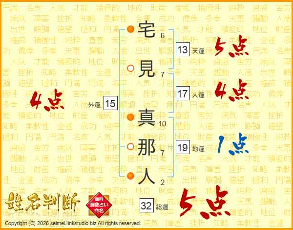 宅(6画)見(7画) 真(10画)那(7画)人(2画)