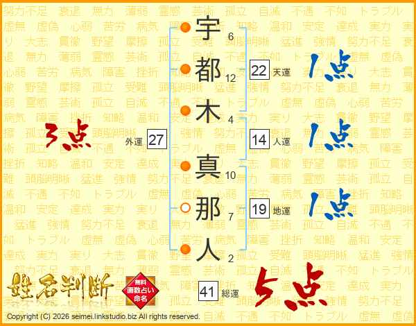 宇(6画)都(12画)木(4画) 真(10画)那(7画)人(2画)
