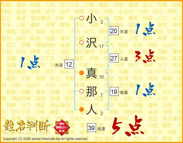 小沢真那人さんの総運は39画の5点!