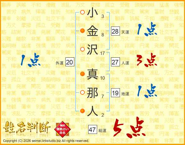 小(3画)金(8画)沢(17画) 真(10画)那(7画)人(2画)
