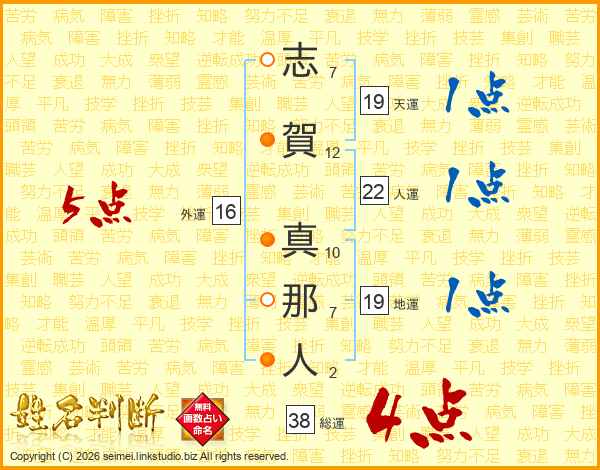 志(7画)賀(12画) 真(10画)那(7画)人(2画)