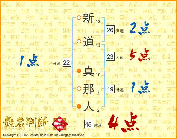新道真那人さんの人運は23画の5点!