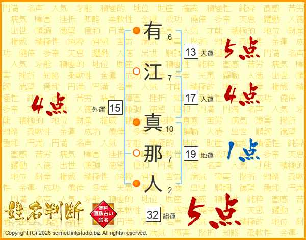 有江真那人さんの総運は32画の5点!