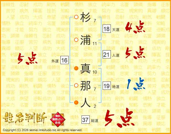 杉浦真那人さんの総運は37画の5点!