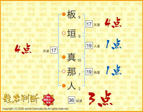板(8画)垣(9画) 真(10画)那(7画)人(2画)