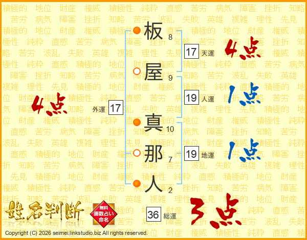 板屋真那人さんの天運は17画の4点!