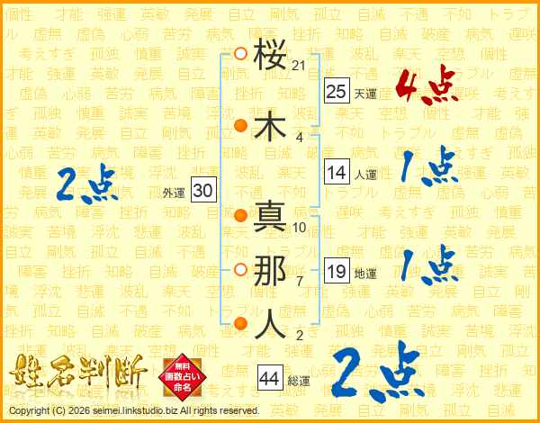 桜木真那人さんの総運は44画の2点!