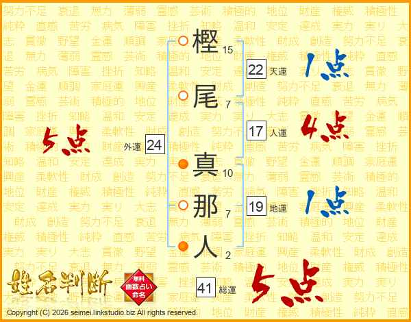 樫(15画)尾(7画) 真(10画)那(7画)人(2画)