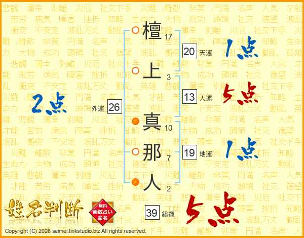 檀(17画)上(3画) 真(10画)那(7画)人(2画)