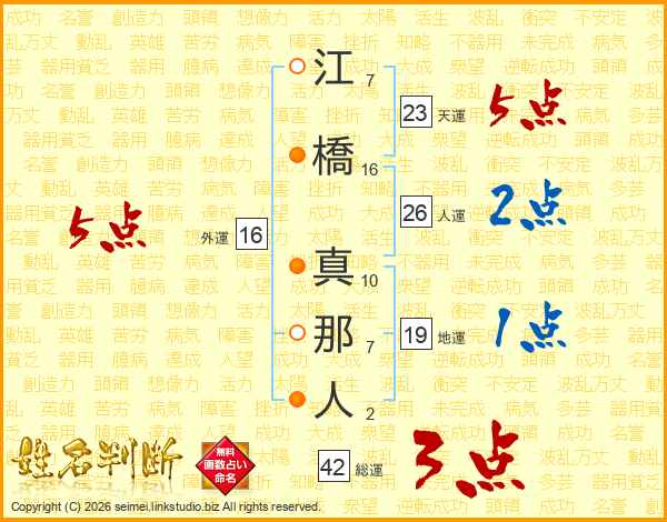 江橋真那人さんの人運は26画の2点!