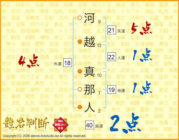 河(9画)越(12画) 真(10画)那(7画)人(2画)