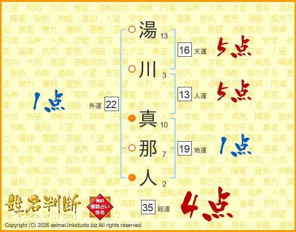 湯川真那人さんの人運は13画の5点!