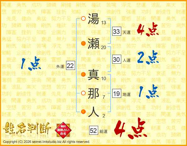 湯(13画)瀬(20画) 真(10画)那(7画)人(2画)