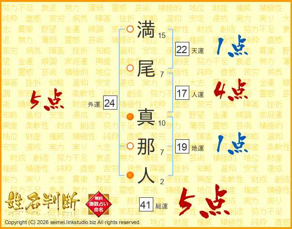 満(15画)尾(7画) 真(10画)那(7画)人(2画)
