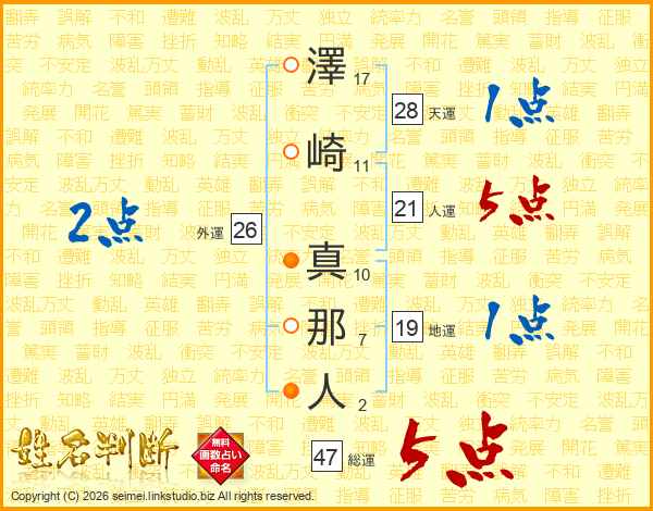 澤(17画)崎(11画) 真(10画)那(7画)人(2画)