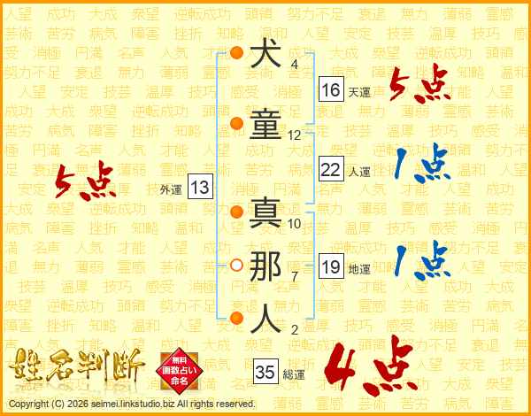 犬(4画)童(12画) 真(10画)那(7画)人(2画)
