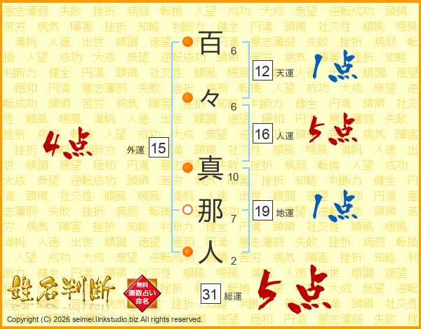 百(6画)々(6画) 真(10画)那(7画)人(2画)