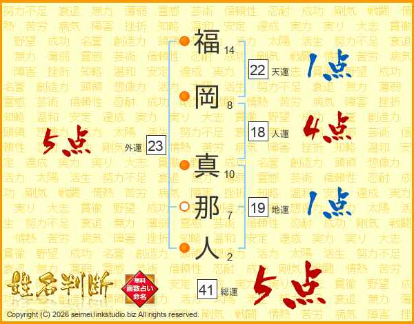 福(14画)岡(8画) 真(10画)那(7画)人(2画)
