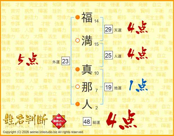 福(14画)満(15画) 真(10画)那(7画)人(2画)