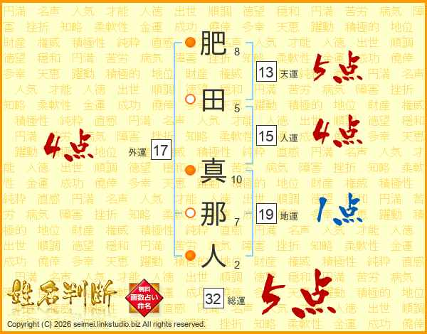 肥(8画)田(5画) 真(10画)那(7画)人(2画)