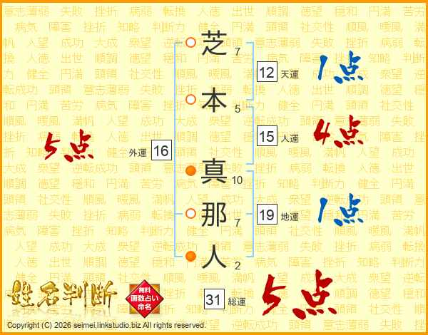 芝本真那人さんの総運は31画の5点!