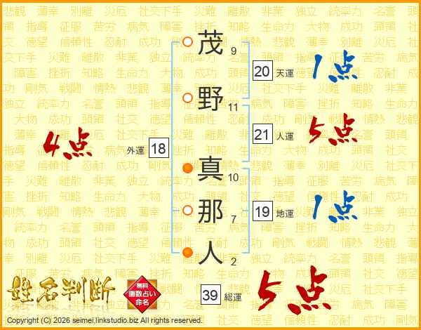 茂野真那人さんの総運は39画の5点!