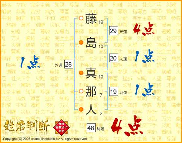 藤(19画)島(10画) 真(10画)那(7画)人(2画)