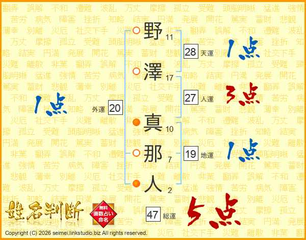 野(11画)澤(17画) 真(10画)那(7画)人(2画)