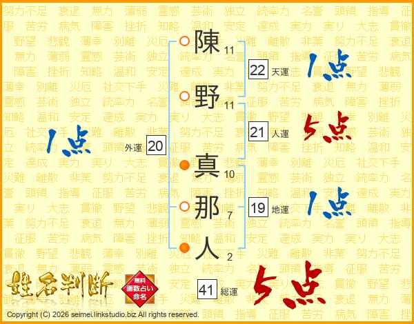 陳野真那人さんの総運は41画の5点!