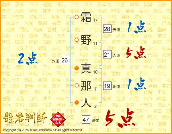 霜(17画)野(11画) 真(10画)那(7画)人(2画)
