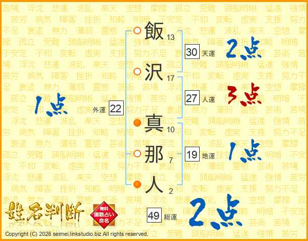 飯(13画)沢(17画) 真(10画)那(7画)人(2画)