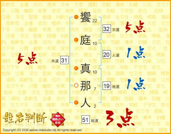 饗庭真那人さんの総運は51画の3点!